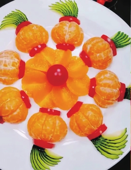 2.砂糖橘每瓣沿背面中间切开,摆入盘中正中央。