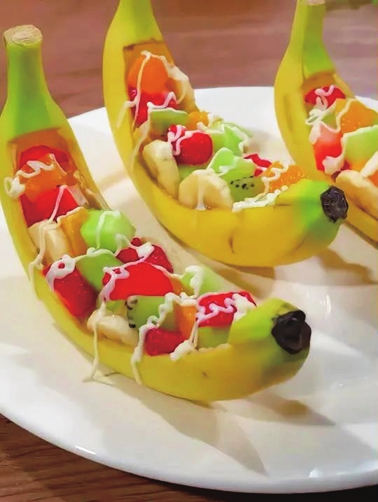 2.拿走上半部分的香蕉皮,取出果肉,备好自己喜欢的各种水果肉。