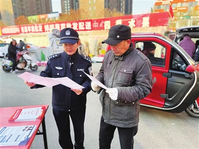 春节临近,购物场所人员密集,近日,长风东派出所民警在辖区蔬果市场、超市宣传防盗、防抢、防骗等安全防范知识,并通过市场广播、电子显示屏循环播放安全提示语,预防侵财案件发生。 辛欣 摄