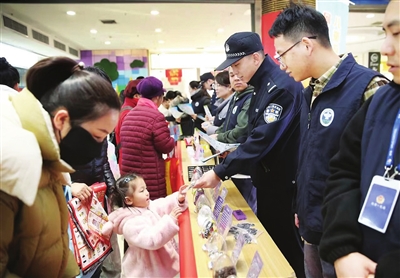 1月23日,郝庄派出所组织社区民警、驻所禁毒社工和“红袖标”志愿者在朝阳街商圈等人员密集场所开展防范电信网络诈骗、禁毒等安全知识宣传活动,提醒群众在日常生活中时刻保持警惕,注意保护好人身和财产安全。 辛欣 摄