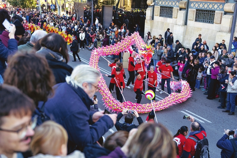 1月25日,在西班牙巴塞罗那,演员在“与巴塞罗那共庆新春佳节”活动上表演舞龙,吸引了众多当地居民参与。
