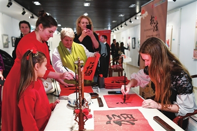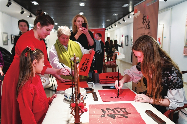 1月25日,人们在俄罗斯莫斯科中国文化中心学写毛笔字。当日,一场春节文化体验活动在俄罗斯莫斯科中国文化中心举行,吸引了众多参与者。 本版图片均据新华社