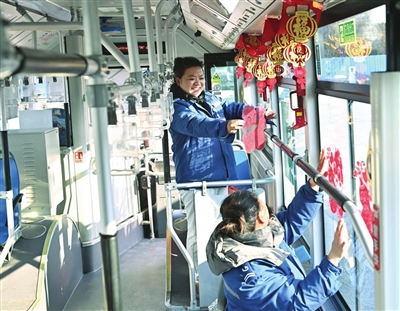 1月26日,为营造浓郁的新春氛围,给市民更美好的乘车体验,863路驾驶员宋海茜利用站休时间,在车厢内悬挂福字、车窗上张贴喜庆的福字和蛇年吉祥窗花,让前来乘坐公交车的乘客都感受到浓浓的年味。 记者 齐向真 通讯员 王玉 摄