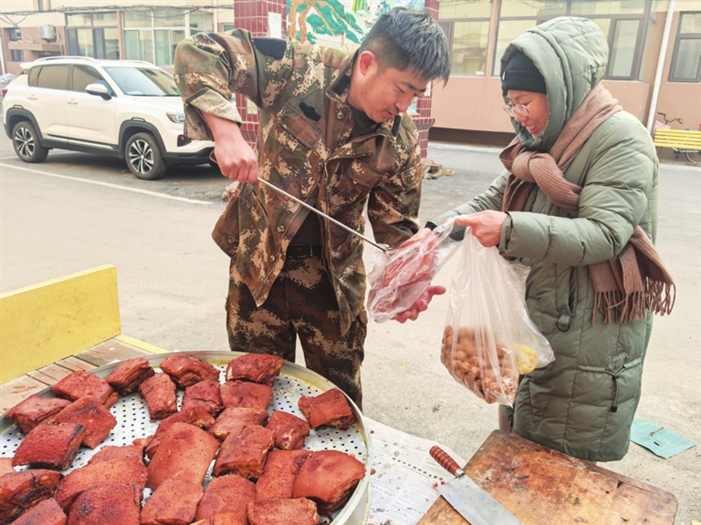 刘小维是饭店的厨师长,也是楼院里的热心人。当他在居民群内发送义务加工肉的消息后,邻居们纷纷找他预订。闲置的小区门房,一下子成了最热闹的地方。现场,他将各家送来的猪肉一一摆放整齐,有条不紊地处理。