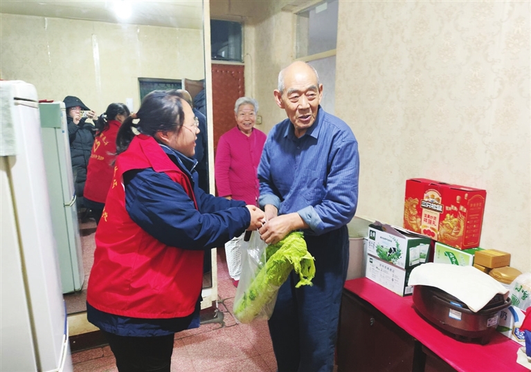 大年初三上午,9号楼高龄独居老人杨桂莲打开门,网格员赵建宏拎着装满蔬菜的大塑料袋,递给老人,“阿姨,这些菜是早上刚运到超市的,你们中午炒菜包饺子正好用上。”临走时,老人硬塞给网格员一把糖果。
