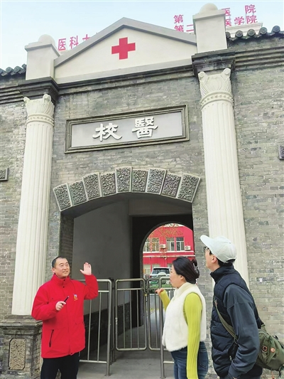 和郑婕、田旭讲解的文物不同,山医大二院社区网格员贾文涛面对的是一座“活”的文物——位于精营东二道街38号的山西省立川至医学专科学校旧址,这里既是省级文物保护单位,而且目前作为山医大二院的办公楼仍在使用。
