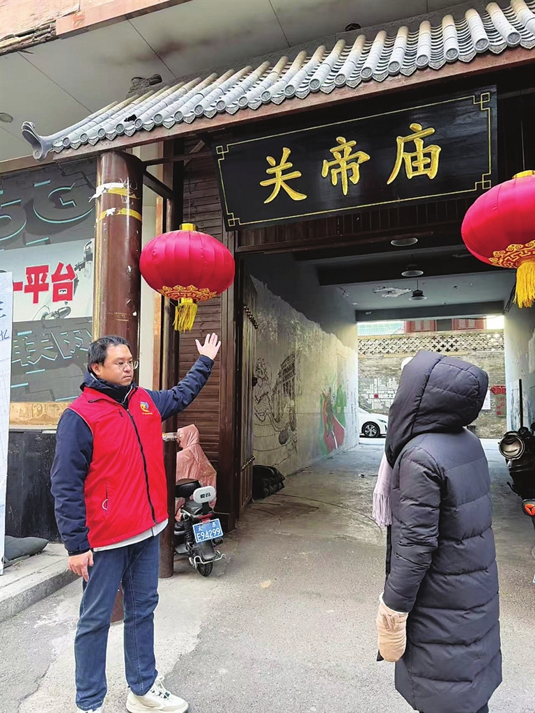 藏于繁华街巷中的南肖墙关帝庙是杏花岭区文物古建中游人最多的景点之一。为了讲好关帝庙,一直对历史文化感兴趣的天地坛社区网格员田旭下了很大功夫,在大量翻阅书籍、查专业资料、看影视剧和短视频的基础上,撰写了十几段关于关帝庙主人公——关羽的“段子”,例如《义薄云天:关羽千里走单骑》,讲述关羽在曹操处得知刘备消息后,毅然离开曹操,护送嫂嫂千里寻兄的故事;《威震华夏:关羽水淹七军》,讲述关羽在襄樊之战中,利用暴雨洪水,生擒于禁、斩杀庞德,威震天下;《单刀赴会:关羽勇闯东吴》,讲述关羽只带一把刀,赴鲁肃之邀,以大智大勇震慑东吴;《刮骨疗毒:关羽的坚韧与无畏》,讲述关羽受伤后,为了继续作战,在没有麻醉的情况下让华佗刮骨疗毒……田旭的讲解非常注重把历史故事和时代精神结合起来,善于运用流行的网络语言和人们喜闻乐见的表述方式,通俗易懂地把中华民族勤劳勇敢、知书达理、善恶分明、智慧善良的品格体现出来。几个月来,听过田旭讲解的不少游客和街道、社区同事们纷纷说:小田对南肖墙关帝庙和关羽的了解,已经犹如一部行走的“庙志”。