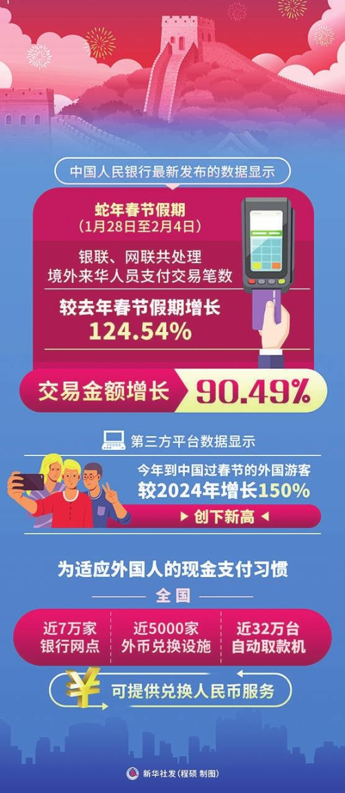 中国人民银行最新发布的数据显示,蛇年春节假期(1月28日至2月4日),银联、网联共处理境外来华人员支付交易笔数较去年春节假期增长124.54%,交易金额增长90.49%。