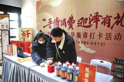 春节期间,我市各商家推出各种优惠活动和趣味游戏持续吸引消费者。图为2月7日,市民在钟楼街游客服务中心集章打卡。 张澍宏 摄