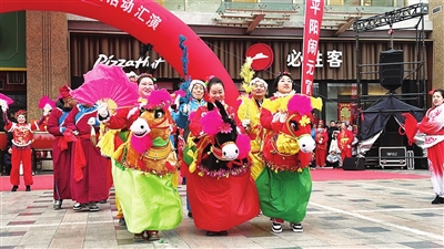 “赶紧来,演出就要开始了,去晚了站不到前头了!”下午2时许,和信广场上锣鼓喧天、人声鼎沸。水总社区选送的社火表演《双龙送福》拉开了汇演的序幕,鼓点如春雷般震撼人心,寓意吉祥腾跃,为整场演出奠定欢腾基调,表演者们精神抖擞,敲锣打鼓、热闹非凡。舞蹈《瑞蛇闹春 元宵舞韵》展现瑞蛇坚韧顽强、华丽蜕变的力量。亲贤社区精心编排了《亲贤龙灯》《旱船》《花轿》《刘三推车》节目,特别是“亲贤老龙”犹如蛟龙出海,翻腾劲摆,势不可当。