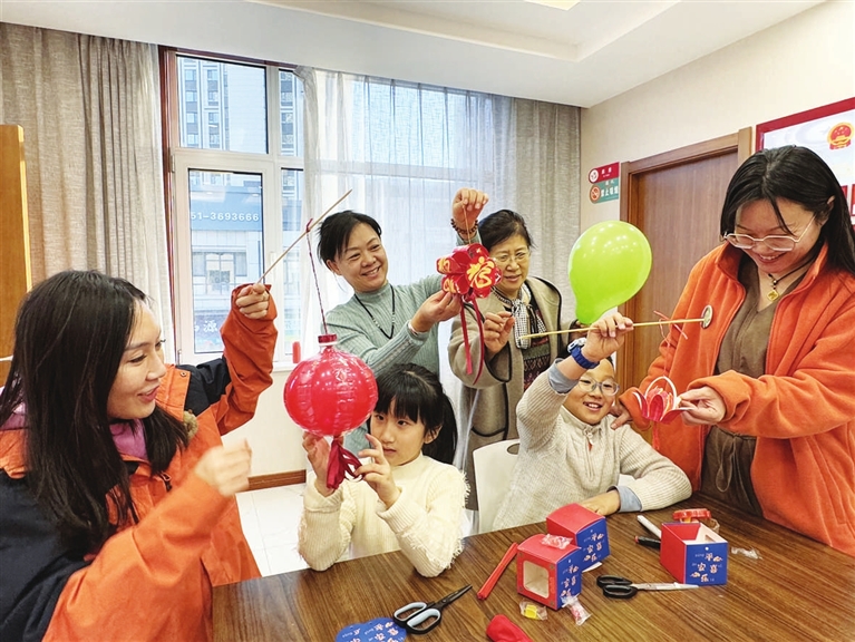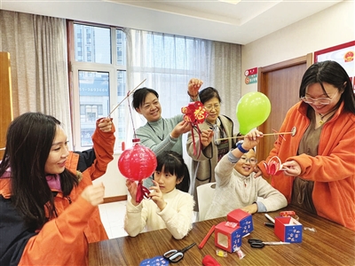 家住涤纶厂小区的陈燕,春节买了不少年货,包装盒、包装纸都很漂亮,但拆掉后只能当废品处理,看着挺可惜。听说社区组织巧手做花灯活动,马上带着材料过来。她与网格员们根据包装盒的形状一起构思。裁剪掉多余部分,盒体划成镂空状,再加以装饰,做出了一盏精美的“宫灯”。
