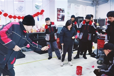“小刘,快来,一起猜灯谜,有难度。”32岁的刘旭东,是一名叉车司机。听见熟人招呼,他笑呵呵点头回应。室内挂了百余条灯谜,供大家竞猜。有人看着谜面,冥思苦想。有人猜出谜底,面露笑容。