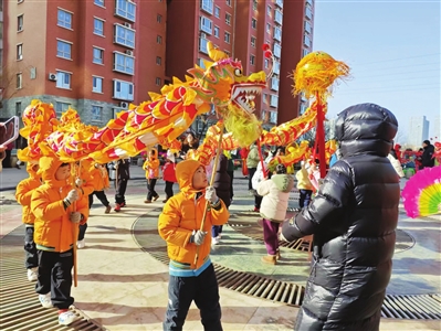 2月12日上午8时许,滨东社区滨东花园小区的喷泉广场上热闹非凡,“咚咚咚,锵咚锵”,欢快的锣鼓声此起彼伏,秧歌队、舞龙队闪亮登场。