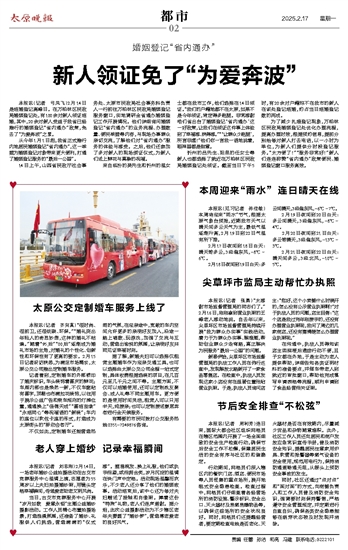 记者看到,定制婚车的外部喷印了婚庆标识,车头装饰着喜庆的鲜花;车厢内部也是焕然一新,不仅车窗贴有喜字,顶棚也布满拉花装饰,以往用于展示公益广告和乘车规则的灯牌位置,通通换上“佳偶天成”“喜结良缘”“永结同心”等祝福语的“新装”;车内的座位以软包卡座的形式,打造成为太原街头的“移动会客厅”。