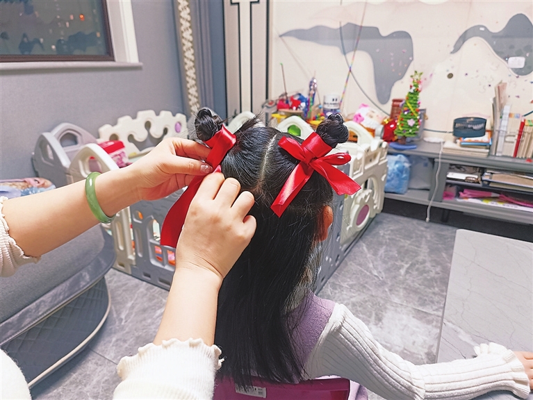 市民赵晓旭带着6岁的女儿“二刷”《哪吒2》,看后仍意犹未尽。回到家,女儿嚷嚷着,要梳一个与哪吒同款的发型。妈妈笑着答应,找来红丝带,给孩子的头上弄出两个“小丸子”。孩子照着镜子,开心不已。