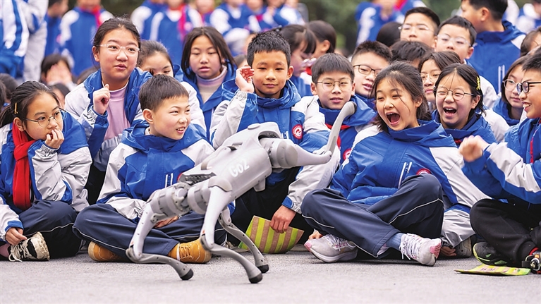2月17日,四川眉山市彭山区第二中学学生在开学第一课科普活动上观看机器狗表演。