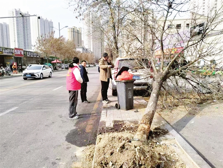 在接到群众反映后,赵婷第一时间赶到事发现场,见此情景,她迅速联系园林部门,向工作人员描述了现场的具体位置、坠落枝干的粗细及树木的大致情况,以便园林部门能够及时安排专业人员和设备前来处理。同时,主动维护交通秩序,指挥过往非机动车、路人有序绕行,避免因避让断木而发生碰撞等事故。她不断地向骑行人和路人解释情况,提醒大家注意安全,引导大家耐心等待园林部门前来清理。