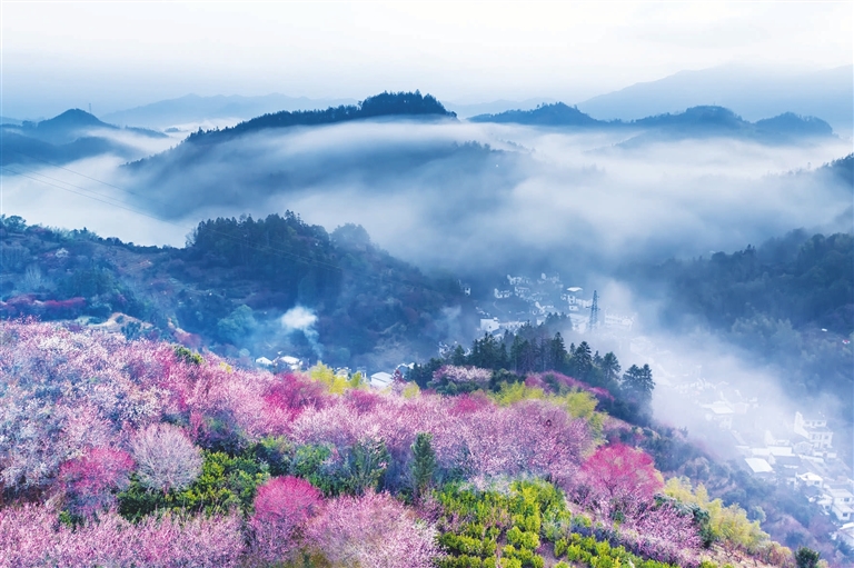 2月16日,在安徽省黄山市歙县雄村镇卖花渔村,绽放的梅花与徽派村落民居相映成趣(无人机照片)。