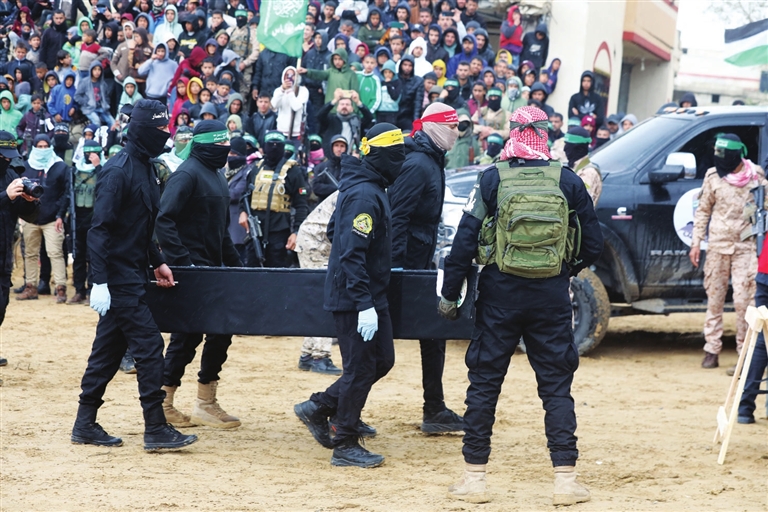 巴勒斯坦伊斯兰抵抗运动(哈马斯)当天在加沙地带将4具被扣押人员遗体移交给红十字国际委员会。巴勒斯坦武装人员在加沙地带南部汗尤尼斯被扣押人员遗体移交现场警戒。