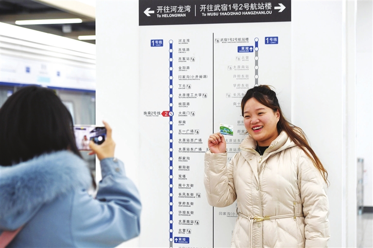 2月22 日,太原地铁1号线黄陵站,乘客在地铁指示牌前记录美好瞬间。地铁1号线的开通运营,着实让乘客感受到出行的便捷。牛利敏 摄