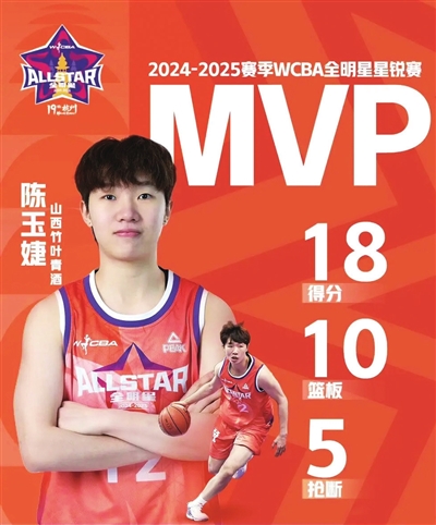最后一节比赛,南北两支明星队开始提升防守强度。奥杜达与江苏队中锋徐晨妍组成的“双塔”在内线火力全开,帮助北区明星队以129比120击败南区明星队。徐晨妍全场“砍”下29分和6个篮板球,当选全明星正赛MVP。