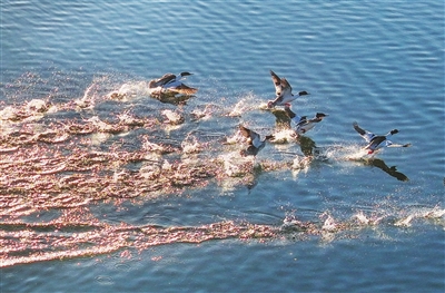 这是2月24日在河北遵化龙门湖拍摄的水鸟(无人机照片)。