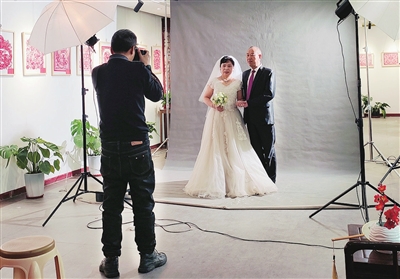 活动现场,老年夫妻们身着婚纱礼服,脸上洋溢着幸福的笑容。在摄影师的悉心指导下,他们摆出各种优雅姿势,镜头定格了每一个美好瞬间。