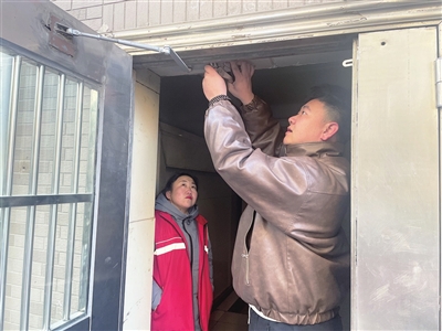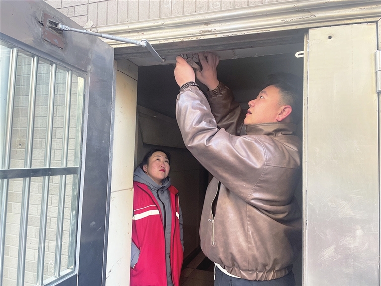 网格员联系物业,可维修师傅正忙着检修电路,下午才有时间。二人犯愁时,26岁的居民韩泽羽路过,得知情况后,马上回家拿来工具,试着修理。小伙拿手机上网搜索,得知门关不上,多为闭合器故障。他站在凳子上,果然发现该配件松动。拧紧螺丝,门顺利关闭。