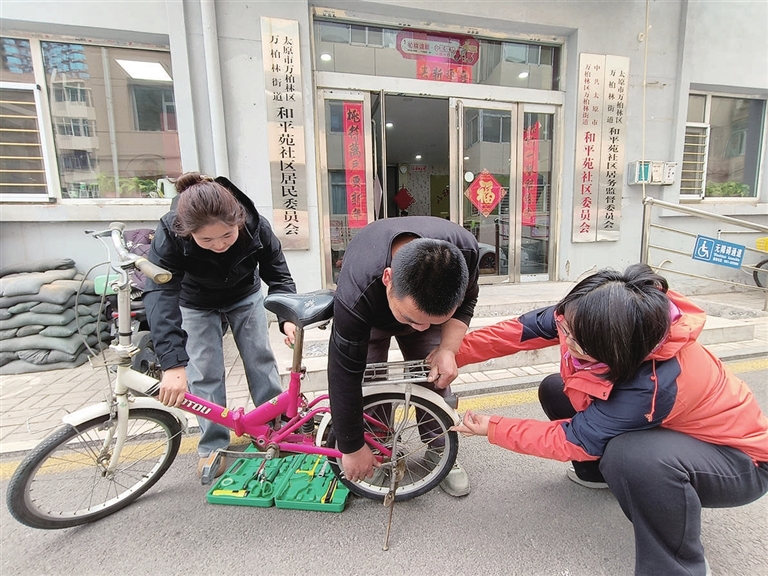 2月28日,和平苑社区的门口支起了爱心修车摊,志愿者免费帮居民修车。网格员刘晓莉在群里发了通知,提醒居民自行车、电动自行车若有故障,可来维修。居民张女士正要去上班,发现自行车的车胎瘪了。志愿者赵师傅检查发现,后胎扎了钉子。不到20分钟,完成补胎,打足了气,张女士道谢后离开。陆续,又有居民过来,志愿者忙个不停。有人称赞:“这样的服务很贴心,解决了大问题。”