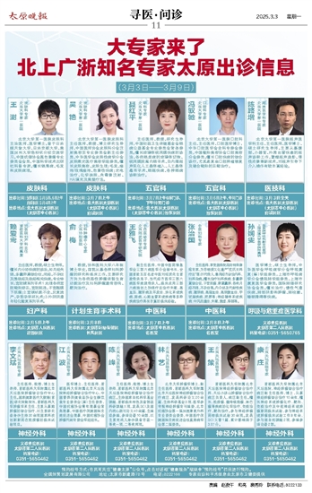 出诊时间:汾东院区:3月5日、6日上午 府城院区:3月4日上午