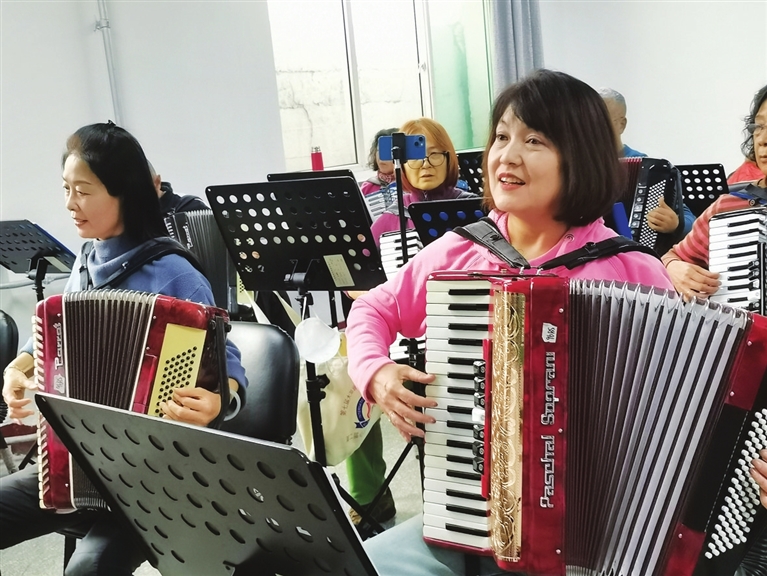 “一个手风琴就是一支乐队,让我痴迷。”今年78岁的冯彦是手风琴中级班的一名新学员,她家住在服装城附近,早上7时许就出门坐公交车来上课,只为心中那份热爱。她说,年轻时没条件学习,可每每听起别人拉手风琴就羡慕不已,所以,报名后,她对新学期充满期待,希望在老年大学圆她的梦。