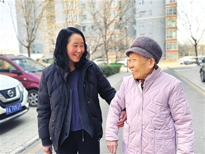 彭改萍(左)每天陪八旬老人裴洪宝散步