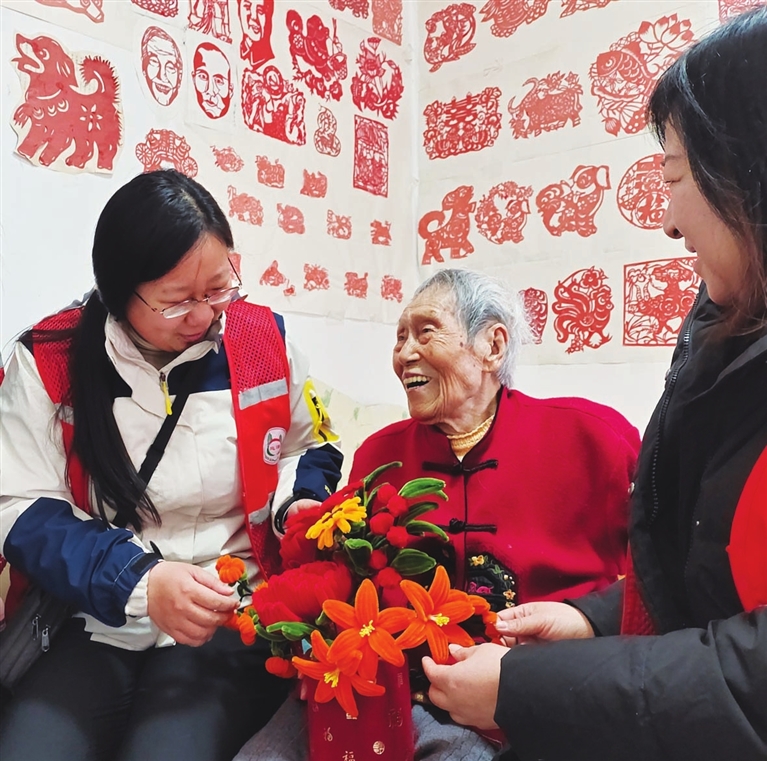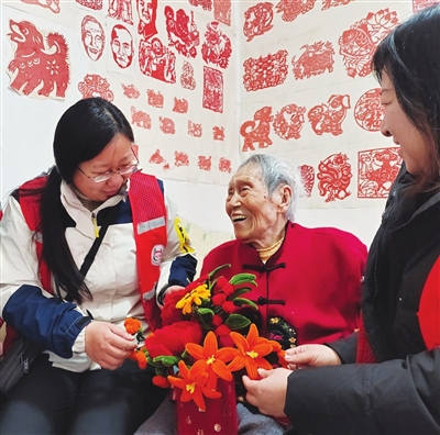 随后,社区工作人员带着这些承载着关爱的手工花,来到辖区百岁老人郎大娘家,为老人送上节日的问候和祝福。老人收到手工花时,脸上洋溢着幸福的笑容,并向大家讲述了自己年轻时的奋斗故事。大家围坐在老人身边,认真聆听,不时发出阵阵赞叹。通过与百岁老人交流,大家深深感受到了老一辈人勤劳坚韧的品质,也更加珍惜现在的美好生活。此次活动,不仅弘扬了中华民族尊老敬老的传统美德,营造了浓厚的节日氛围,也让辖区女性同胞和百岁老人感受到了社区的关怀和温暖。