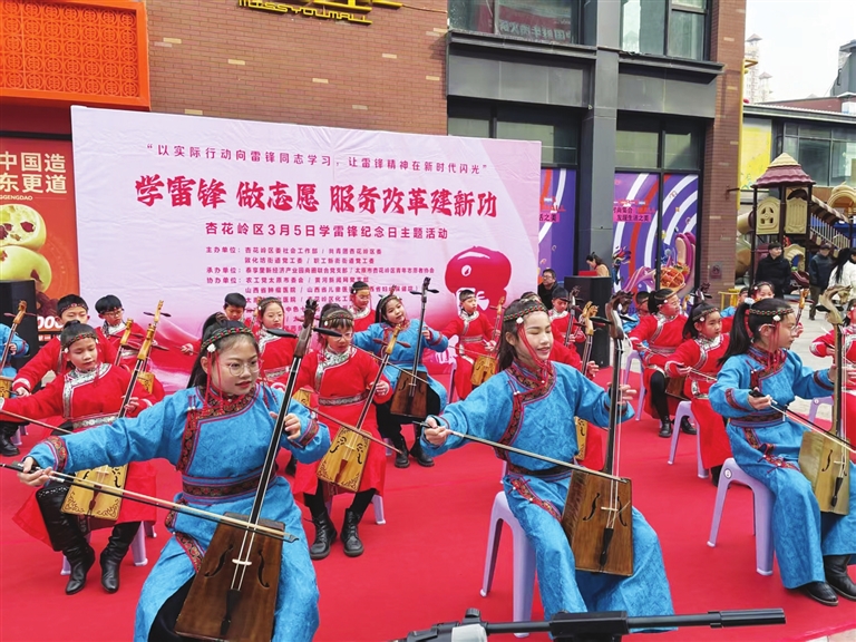 3月4日,太原市杏花岭区“学雷锋纪念日”大型主题活动在泰享里中心广场举行。活动包括义诊、法律咨询、文艺表演等志愿服务。图为化工路小学的20多名学生表演马头琴。 牛利敏 摄