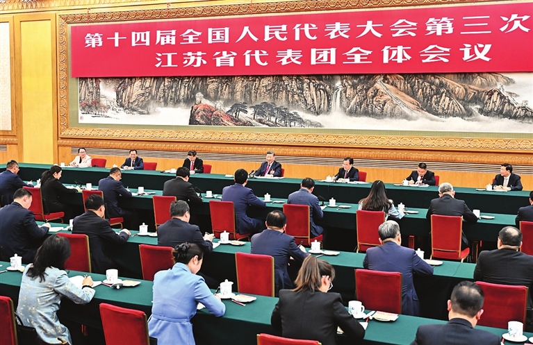 在听取大家发言后,习近平作了发言。他首先表示赞成政府工作报告,对江苏工作予以肯定,希望江苏落实好挑大梁的责任,努力取得新的更大成绩。
