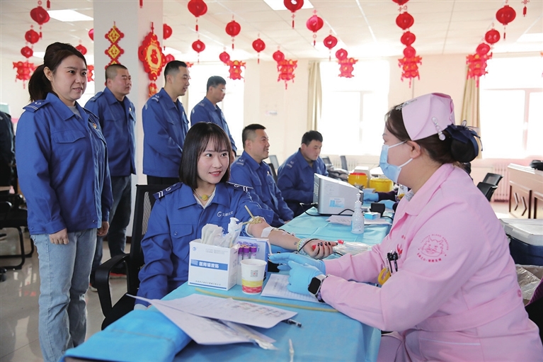 三月五日,太原公交第三汽车分公司党委、团委组织百余名员工无偿献血,彰显企业社会责任感。王韵菲 摄