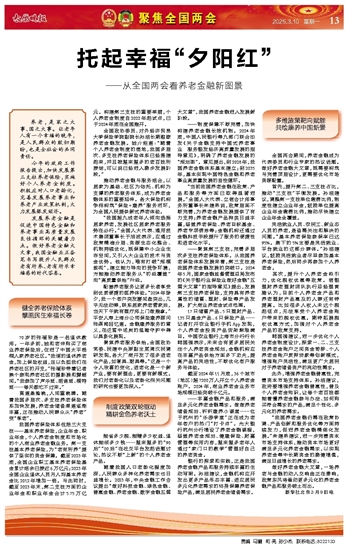 “当前我国养老金融在政策、产品和服务等方面已取得显著进展。”全国人大代表、立信会计师事务所董事长朱建弟说,政策层面不断完善,为养老金融发展提供了有力支持;养老金融产品种类日益丰富,涵盖养老保险、养老目标基金、养老专项债券等;金融机构还通过金融科技手段提升了服务的便捷性和适老化水平。
