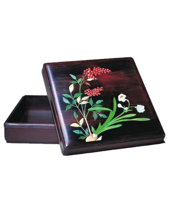 这只方匣的镶嵌工艺更是匠心独运。画面中,天竺顺应自然之势生长,水仙则以斜逸之姿点缀其间,布局巧妙,逸趣横生。水仙的叶片翠绿欲滴,为整个画面注入了盎然活力;而那挺拔的天竺,其嫣红的果实与水仙的碧绿交相辉映,冷暖色调对比鲜明,使得整体色彩既明亮欢快又不失高雅风范。