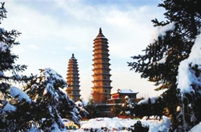 双塔用形家者言,补太原文峰,各十三层,朝暾初旭,垂影河中,云仿佛笔之蘸研池也。