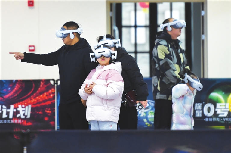3月11日,省城钟楼街一家虚拟太空体验馆内,市民佩戴VR眼镜进行沉浸式参观。这种参观方式让市民感受到科技魅力。 邓寅明 摄