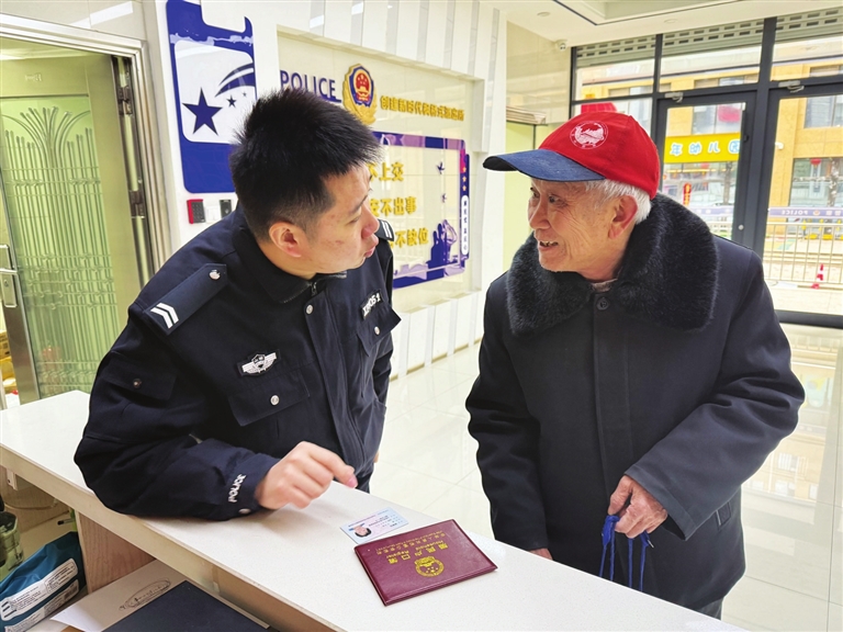 3月11日,一名年过八旬的老大爷来到庙前派出所,用手比画表示自己听力不好。民警通过耐心沟通,得知老人前来办理户籍业务,很快为其开具户籍证明。接过证明材料,老人连声称赞民警的贴心服务。 辛欣 摄