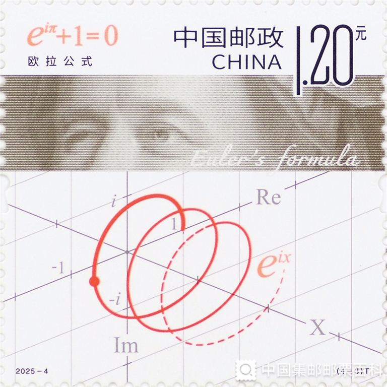 第三枚“欧拉公式”,被誉为“数学中最美的公式之一”。邮票以图形的方式表现了欧拉公式,将数学中5个重要常数(e、i、π、1、0)联系起来。第四枚“莫比乌斯带”,邮票采用局部烫印工艺,丰富的色彩变幻更好地呈现莫比乌斯带的多维性质。