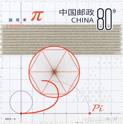 第一枚“圆周率”,作为广为人知的数学常数,贯穿于几何、物理等众多学科。邮票元素包含了π的本质定义,以极细线表现早期经典割圆法,并将圆周率小数点后996位以缩微文字的方式呈现于画面,特别通过橘色设计突出前7位,纪念我国南北朝时期数学家祖冲之。第二枚“勾股定理”,是中国古代几何学的成就之一。邮票在局部采用烫印工艺,以分层的视觉形式展现了证明过程。