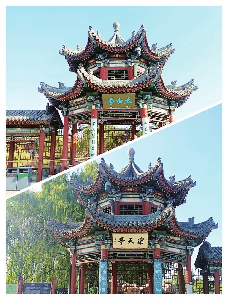 2017年,晋祠博物馆向东扩展,不仅将区间内的古迹扩充进来,还精心增设了大量仿古景观,构成了晋祠公园。公园依照古晋祠坐西朝东的传统格局设计,大门依然朝东,临街的通衢大道被赋予“晋阳大道”这一蕴含历史底蕴的名字。从晋阳大道到晋祠公园正门,要经过一个广场。广场的两侧由隔断式长廊连接,长廊中部,四对亭台两两相对、分布对称,太白亭和乐天亭是第一对亭台。
