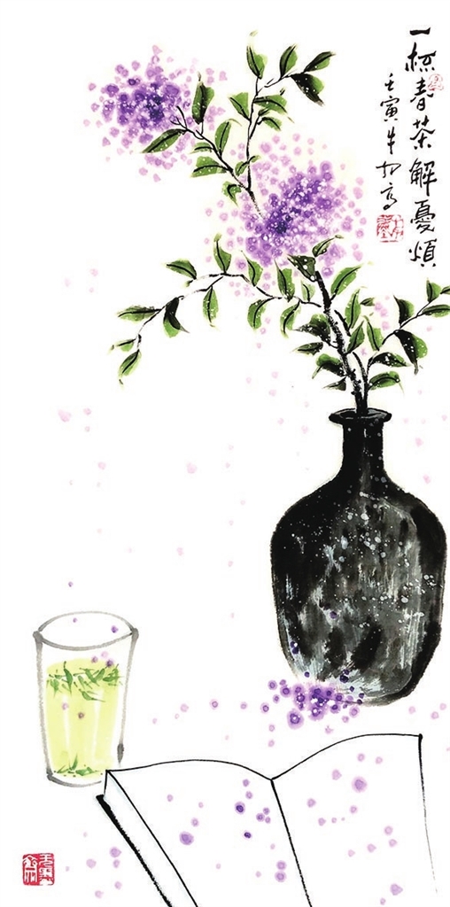 一杯春茶解忧烦(水墨画) 牛 力 绘