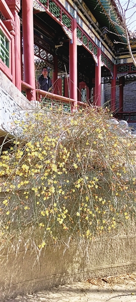 龙潭公园、文瀛公园的迎春花也已悄然绽放,点点金黄小巧玲珑,像一颗颗闪耀的星星,点缀在翠绿的枝条上。在湖岸上、在假山旁,在阳光下、在春风里,与湖水、廊亭共同绘成春之美景。