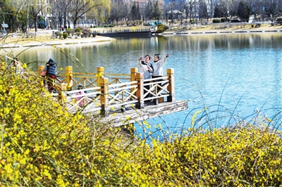 3月19日,学府公园中心湖边的迎春花绽放,传递出春天的气息。随着天气转暖,我市各大公园即将进入赏花期。