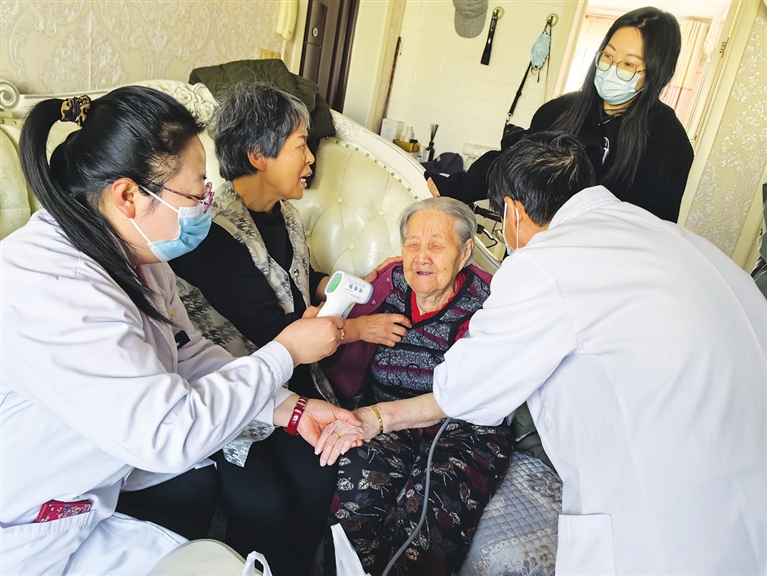 当天上午,江阳社区干部、网格员和社区卫生服务站医护人员登门,为109岁老人程云梅免费体检。医护人员现场为老人进行了基础健康检查,量血压、测体温、测血糖等后,结果显示一切正常。老人的女儿表示,母亲这两天老咳嗽,嗓子有点出血,医护人员对其肺部和口腔进行了检查,发现老人的嗓子红肿发炎,初步判断是因为上火导致嗓子发炎引发出血。