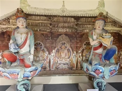 此次“盛唐遗韵”展的另一个主题是“盛唐遗珠”。它以中国仅存的几座唐代木构建筑为核心,展示了南禅寺、佛光寺、广仁王庙独特的建筑风格与精湛工艺水平。走进展厅,首先映入眼帘的是通过3D打印技术复制的佛光寺彩塑供养菩萨像,其右手边便是梁思成手绘的五台佛光寺东大殿图像复印件。几笔简约的勾勒,记录下这些木构件的精巧。中国目前仅有三个半唐朝的木构建筑,称之为“遗珠”,确实恰如其分。