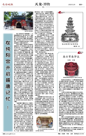 “盛唐遗韵”展重点对比了唐朝三都——长安、太原、洛阳的政治经济脉络与布局演变。事实上,三都的城市布局深刻体现了道家“天人合一”的理想境界。以长安城为例,宫城象征北辰(北极星),被视为宇宙的中心;皇城百官衙署象征环绕北辰的紫微垣;外郭城象征向北环拱的群星。道家“天人合一”的思想,贯穿古今,深深融入我们生活的每个角落。唐朝皇帝秉持“道无常名,圣无常体,随方设教,密济群生”开放思想的生动体现,践行黄老之道,不仅造就了灿烂的文化,更成就了繁荣强盛的大唐。有一个展室入门即是满目的唐诗。再看李白的诗风,满是放荡不羁、飘然若仙的韵味。李白曾写道:“长安白日照春空,绿杨结烟垂袅风。”又说:“晋祠流水如碧玉,微波龙鳞莎草绿。”还言:“忆昔洛阳董糟丘,一醉累月轻王侯。”盛唐的三都给李白留下了美好的回忆,也成为无数文人墨客尽情倾诉的对象。太原,作为在唐朝被称作北都、北京的地方,留存着众多传奇故事,至今在晋阳大地仍保留着景清门等古老的宫殿名。笔者曾前往西京长安探寻那段历史,如今又在展厅中见到东京洛阳的一片板瓦,巧的是,这片瓦背上留有“匠唐子蒿”的印。这是否是冥冥之中安排的一场跨越时空的宗亲相见?太原唐氏从北魏到李唐时期皆为望族,可他为何会在东京洛阳成为一名瓦匠?这无疑又是一个历史谜题。